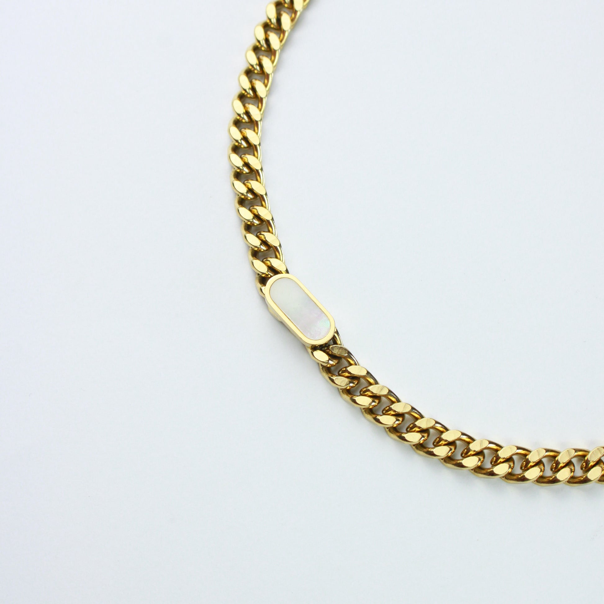 Elevate your style with our White Stone Curb Chain Choker. This luxurious gold chain choker will add a modern and edgy touch to any outfit. Featuring a stunning white marble stone and made of waterproof stainless steel, it is both durable and elegant. Discover the perfect balance of sophistication and style.